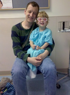 So we sat her down and said the Caillou videos were a treat for her after the operation she was going to have. I said in a couple weeks we would go to the hospital, just like Franklin (the turtle) goes to the hospital and Curious George goes to the hospital. Zoe loves reading about and playing doctor. We recently got a book from the library called Daisy the Doctor and we’ve all read it to her many times. And she knows Mommy and Daddy and Poppy have all had operations and come home needing to rest, but otherwise ok. So I briefly explained that the doctor was going to work on her eye so it can open more and that will make it easier for her to see. And afterward we’ll go home and watch videos. She said “OK” and slid off my lap to go play.