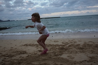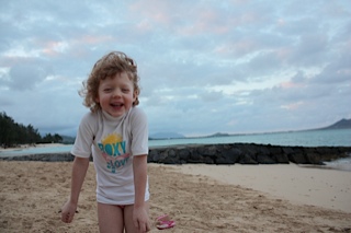 At this point it was late afternoon, so we were closing in on sunset and desperately wanted a little playtime somewhere. So we headed back toward Kailua and stopped at the first parking lot we could find and raced down to the shore. We decided it was a little too overcast and chilly to swim, but we played in the sand and dipped our toes in the water.