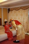 Randy and I especially enjoyed learning about and observing some of the traditional Chinese wedding rituals that Joanne and Clint included in the celebration. Clint had to spend the night in a different hotel the night before the wedding and arrive at the door of Joanne’s room early the next day to try to bribe his way in. Traditionally, the would-be groom must offer the bride’s family increasing amounts of money, in little red envelopes, until the family is satisfied with the price. The cash is not sufficient, however. The bride’s family can also ask the groom to perform any number of feats of intellect or strength or bravery, such as doing push-ups or sit-ups, eating or drinking very spicy things, or answering riddles. Since there were so few people there, Clint didn’t have too tough of a time. He negotiated mainly with Rachel, who was firm but not unreasonable. I’m not sure what the final price was, but Rachel took a picture of Esther holding a check. I’m pretty sure it won’t be cashed.