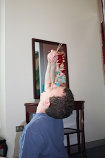 Zoe wanted to participate in the testing, so I asked her to come up with a riddle. We thought of one prominently featured in an episode of Dora, the Explorer, when the ugly old troll asks Dora and Boots to solve his riddle before they can cross the bridge: What goes up when rain comes down? Easy, right? Apparently Clint is too smart for his own good. He suggested temperature, air pressure, the barometer, and various other answers before someone gave him a clue that the desired answer was umbrella. Zoe also asked him to do five jumping jacks. He did a great job.