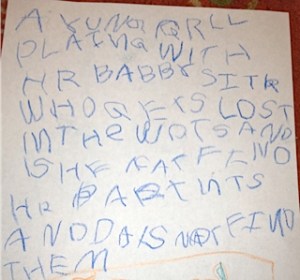 Perhaps that raises some strange issues of babysitter abandonment or separation anxiety, but we’ll deal with that later. To be fair, in real life her regular babysitter’s last day is tomorrow, and right before she wrote this she had become separated from me while climbing on this three-story structure (I could see her but she couldn’t see me).