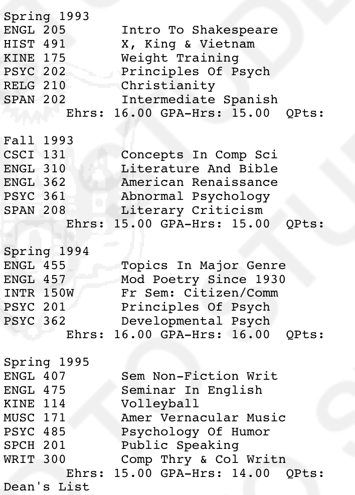 I am not in graduate school or even taking a class at a community center. This was my college transcript, from roughly two decades ago. In those 20 years I have built a successful career as a writer, editor, and communications consultant. I’ve worked as in-house communications officer for two organizations and launched my own business 10 years ago. People hire me because I am an excellent writer and editor and no one has ever asked about my grades from college.