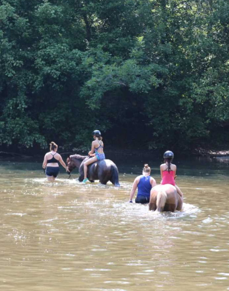 A: I spent three hours every morning riding. My horse was named Chocolate Chip, but I called him Chip. The counselors called him Chipwich. I learned to trot and I learned how to go into two-point, which was holding on to the horse’s reins and mane and lifting your bottom up out of the saddle and holding your shoulders back. That’s to stay stable while the horse is trotting. One day one of the counselors made a big x in the middle of the indoor ring. The first three times my horse went over it, he trotted up like he was supposed to and then he slowed down and stepped over it. But the fourth time he jumped! I had not learned to jumped yet so I fell forward off the saddle and onto the horse’s neck and let go of the reins. I was just holding onto his mane. It was terrifying. There were five girls including me in my riding group. They were all at least two years older than me. One day we took a horse named Bugz Bunny to the river and rode bareback in a circle in the river. While we were waiting for our turn or after we had a turn we got to swim in the river. We could not go past the lifeguards. Even though there was a current we were perfectly safe.