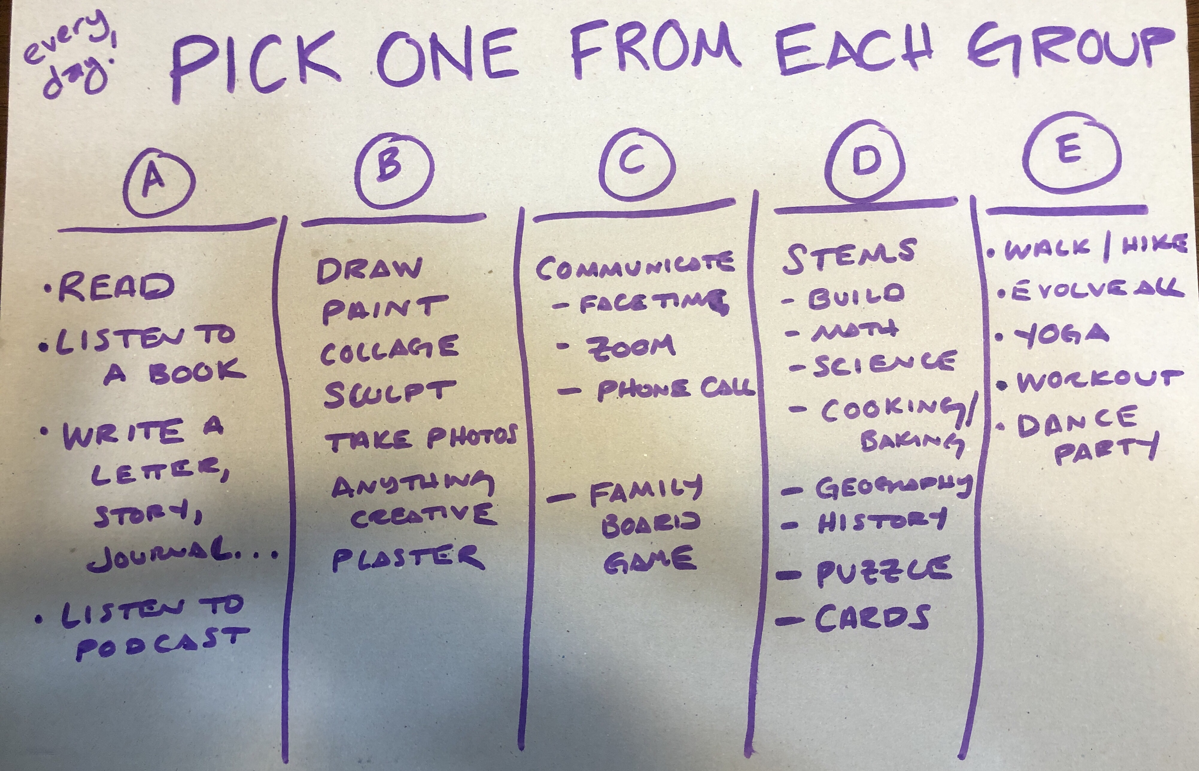 In my attempt to wrap my head around “the new normal,” a phrase which fills me with sadness, I sat down with the kids and created a new plan. Instead of having a schedule where we do certain activities at particular times, or even in a specific order, we’re going to choose one item from each of five categories. Of course we can do more than these, and probably sometimes we won’t do all of them, but hopefully this will seem like a manageable daily routine. And hopefully if the kids are able to plan out their choices every morning I will be better able to carve out time for not only my work but also my mental health.