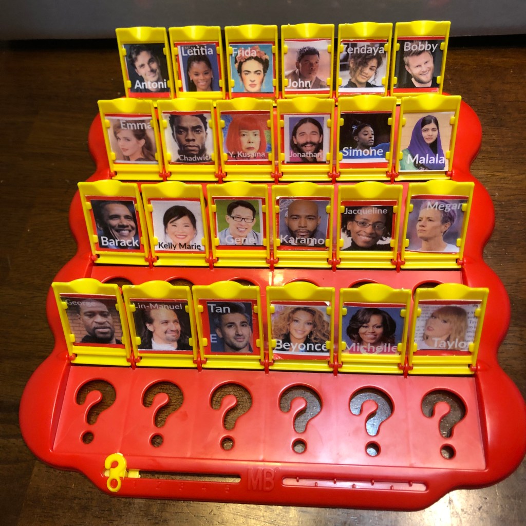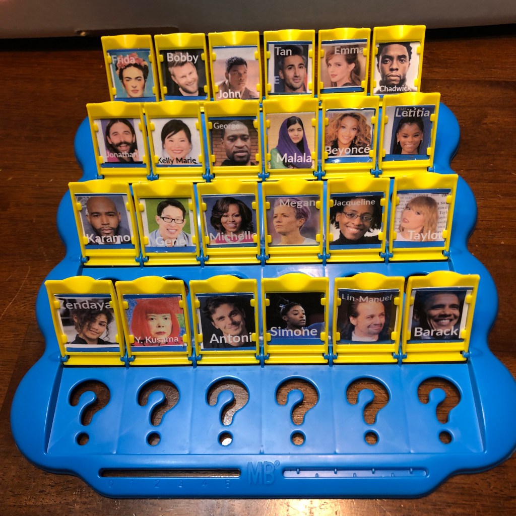 After I put Zeke to bed tonight, Zoe wanted to play our Guess Who? Remix. The first round we played the traditional way, just asking questions about obvious physical characteristics. Then I suggested we make it more challenging, and ask questions whose answers were not apparent. Turns out, this is harder and much more interesting. Questions like, “Does your person get up in front of crowds?” Or “Has your person written a book?” Or “Was your person born in America?” Sometimes we still ended up asking “Is your person female?” Or “Is your person gay?” Or “Is your person Black?” but we tried hard to go deeper. And we had to look up some information online to make sure we were answering accurately. I imagine tomorrow when I play with Zeke he will have a few more gaps in his in-depth knowledge of all the people, but he is curious and I think we will learn together.