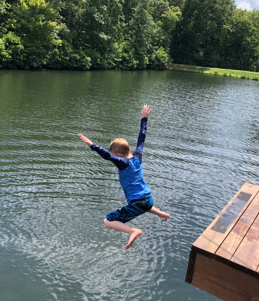 Many of our hours at camp were spent in the lake, either swimming or kayaking. They open the lake for boating in the morning and swimming in the afternoon. You can also fish there as well. We actually borrowed fishing gear for the trip but the kids never got around to using it. I was reminded that I actually like kayaking, and that Zeke can actually do it on his own–although he did get kind of stuck in some bushes at the edge of the lake at one point, but Randy extracted him. Camp Director Ashleigh (originally from South Africa) and another camp staffer Amy (originally from England) were on lifeguard duty the whole time we were there, so we enjoyed chatting with them a lot. They (along with literally everyone at Camp Friendship) are super friendly and welcoming. Kayaks, canoes, paddles, life jackets, and inner tubes are all provided at the lake. They are sanitized between uses.