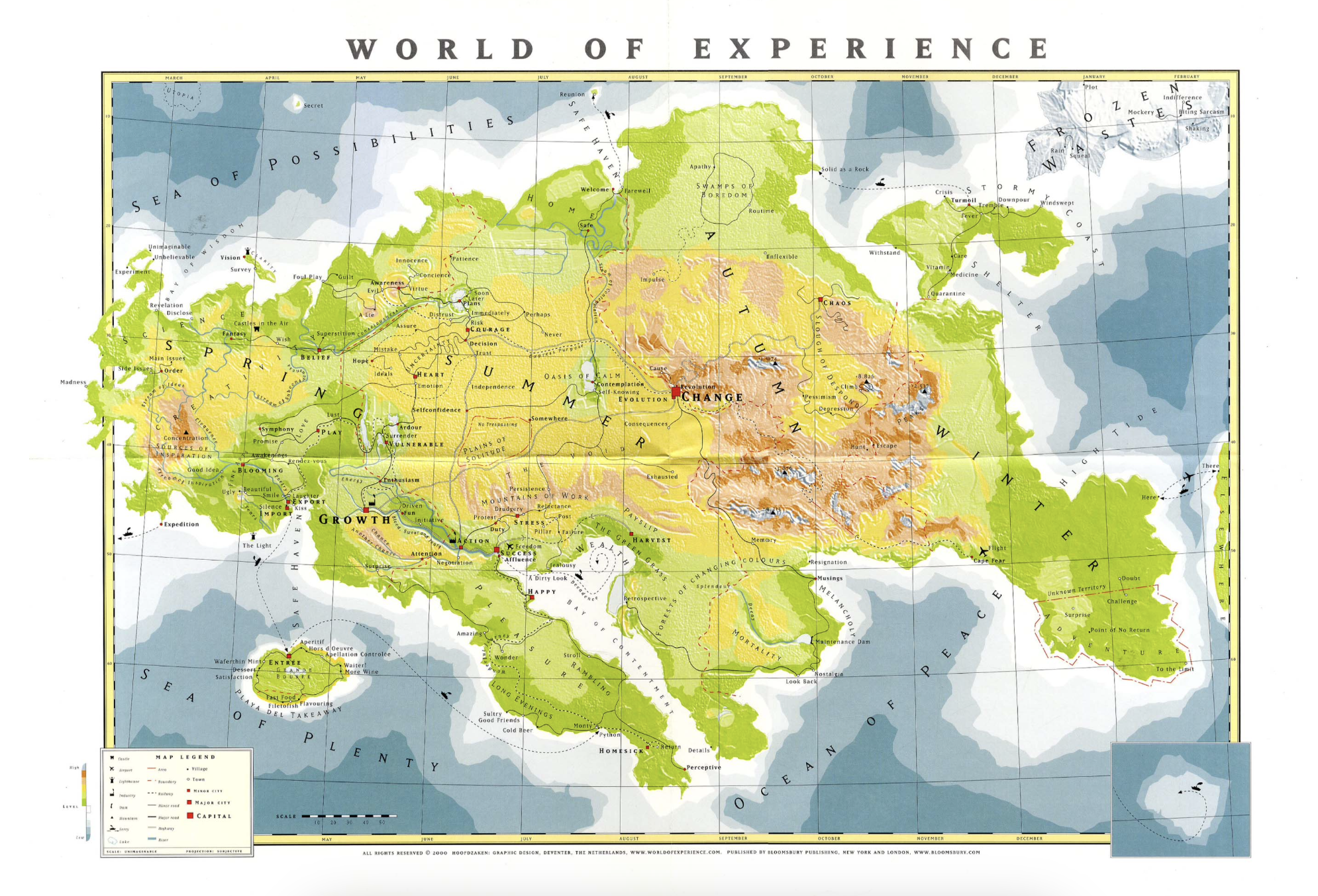 One of my favorite activities during the LEAD workshops was using the World of Experience as a tool to examine where I’ve been and where I want to go. If you’ve never seen it before, you can check out the World of Experience at the LEAD table in the fellowship hall after the service. In the meantime, picture this in your mind. A map that, at first glance, looks like it could be a two-dimensional representation of the Earth. On closer inspection, however, the familiar continents and oceans are replaced by other geographies, named for elements of the human experience. For example, the sea of possibilities, mountains of work, and plains of solitude.