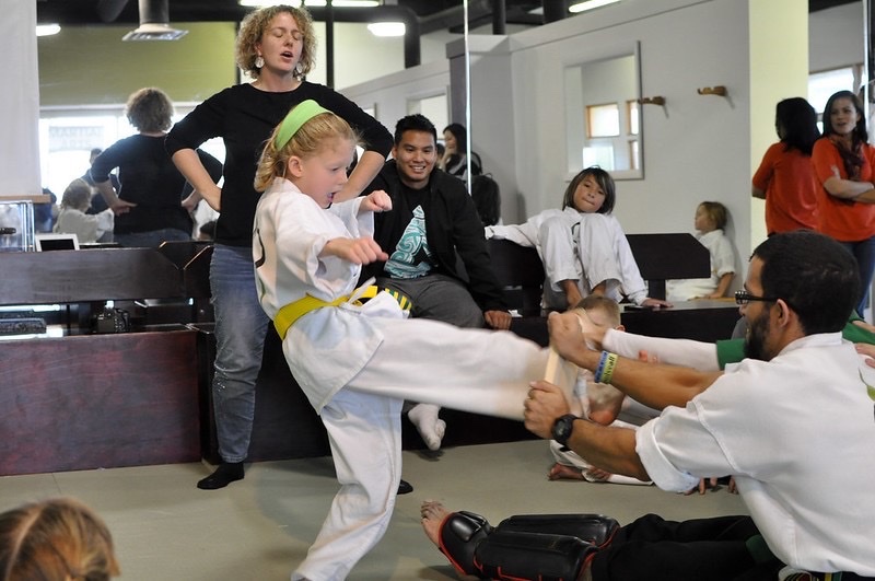 For a long time I watched Zoe practicing martial arts and, while of course I was proud of the hard work she was doing with her body and mind, I wondered if she was going to really get it. Even though every parent knows they’re not supposed to compare their kids to other kids, when you’re sitting there watching other kids seemingly excel at a difficult task with ease, it can be hard not to wonder why it’s hard for your kid. Sometimes I felt like Zoe was performing a dance–which was beautiful–based on martial arts, rather than actual martial arts. I remember for the first few years she was practicing, Mr. Christian would constantly remind her to kick higher–above her belt. I remember watching her during class and seeing her mind wander as she got distracted or played with her hair or her belt or just gazed out the window. I would try to get her attention with my mind and look intently at her, motioning that she needed to look at the instructors and pay attention. I’m sure I said it out loud more than once. Probably not that helpful.