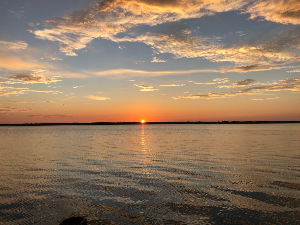 On the morning when Zoe woke me up at 5 to walk down to the dock to watch the sun rise, which I am still amazed she did given her proclivity for sleeping in, we heard several roosters crowing to announce the dawn and several dogs–perhaps Mabel included–barking and howling in response. Watching the sun rise over the river was glorious. And when we turned around to go back to the house, a double rainbow was visible even though we hadn’t seen a drop of rain. At night, we could see more stars than seemed possible when you’re used to living in light pollution. Simply looking out at the expanse of grass, the trees, the water, and the sky every day was such an unexpected balm.