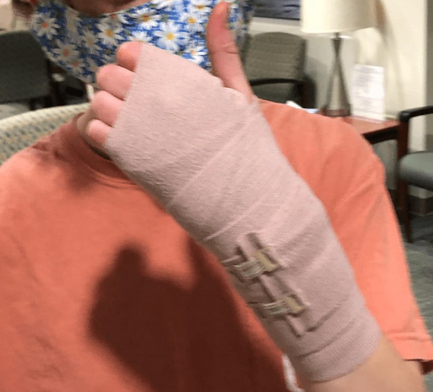 Now we’re safely home and Zoe is feeling much better. Thankfully nothing is broken. The nurse at urgent care carefully removed all the bandages and cleaned everything again and reapplied medicine and put fresh bandages on. She wrapped an ace bandage around Zoe’s hurt hand and wrist.